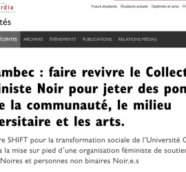 Extrait : « Le Centre SHIFT pour la transformation sociale de l’Université Concordia financera la mise sur pied d’une organisation féministe de soutien aux femmes Noires et personnes non binaires Noir.e.s. Un nouveau projet communautaire mené en collaboration avec l’Université Concordia vise à faire revivre « la tradition d’organisation du féminisme […]